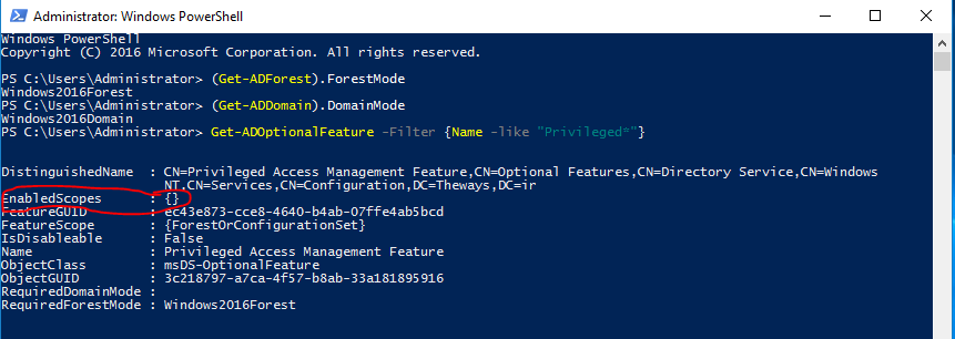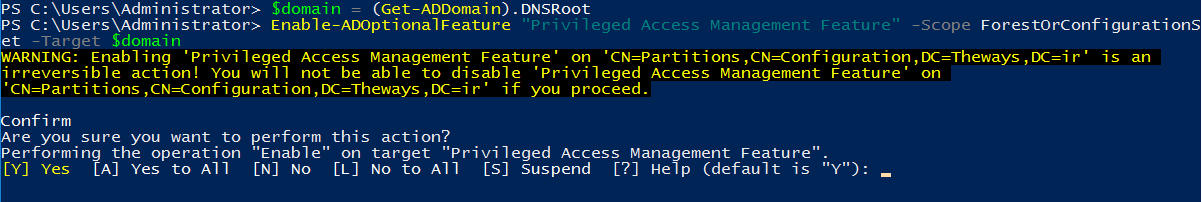 Enable-ADOptionalFeature “Privileged Access Management Feature” -Scope ForestOrConfigurationSet -Target $domain
