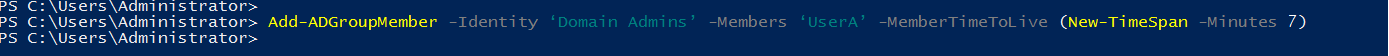 Add-ADGroupMember -Identity ‘Domain Admins’ -Members ‘UserA’ -MemberTimeToLive (New-TimeSpan -Minutes 7)