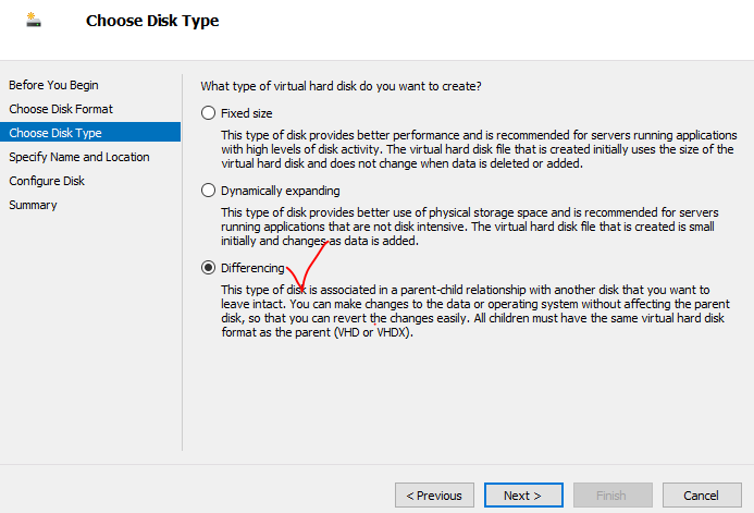 اکنون ماشین مولد یا اصلی یا همان Parent ما آماده شده و میتوانیم ماشین های فرزند یا همان Child ها را که قرار است به عنوان ماشین مجازی مستقل و مجزا از هم به زیروکلاینت های خود ارائه دهیم می سازیم . برای این کار از منوی اصلی سرویس هایپر وی مراحل ساختن دیسک مجازی را دنبال خواهیم کرد و گزینه Differencing را انتخاب و هارد دیسک ماشین مولد را به عنوان هارد دیسک اصلی و Parent در نظر خواهیم گرفت :