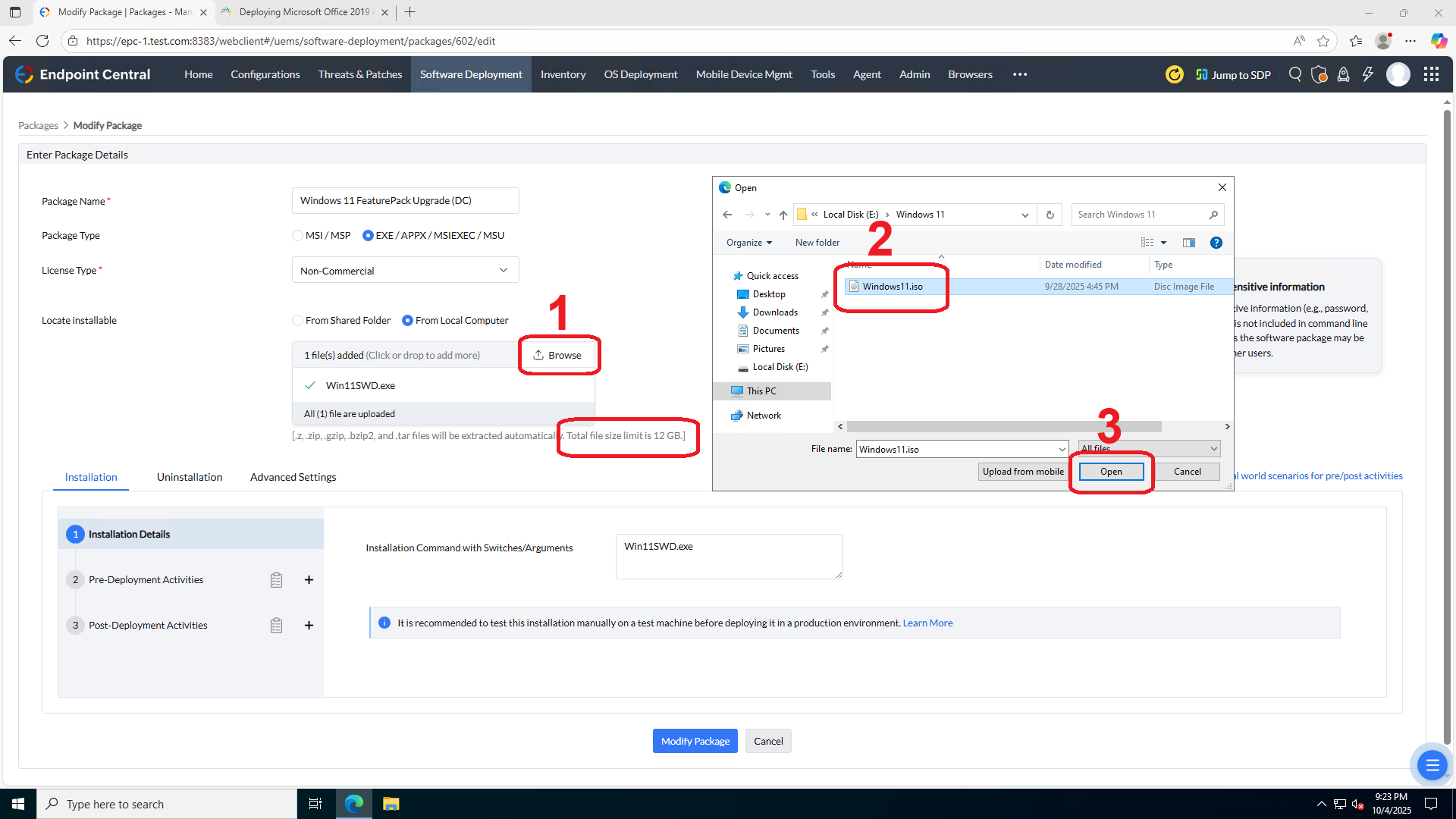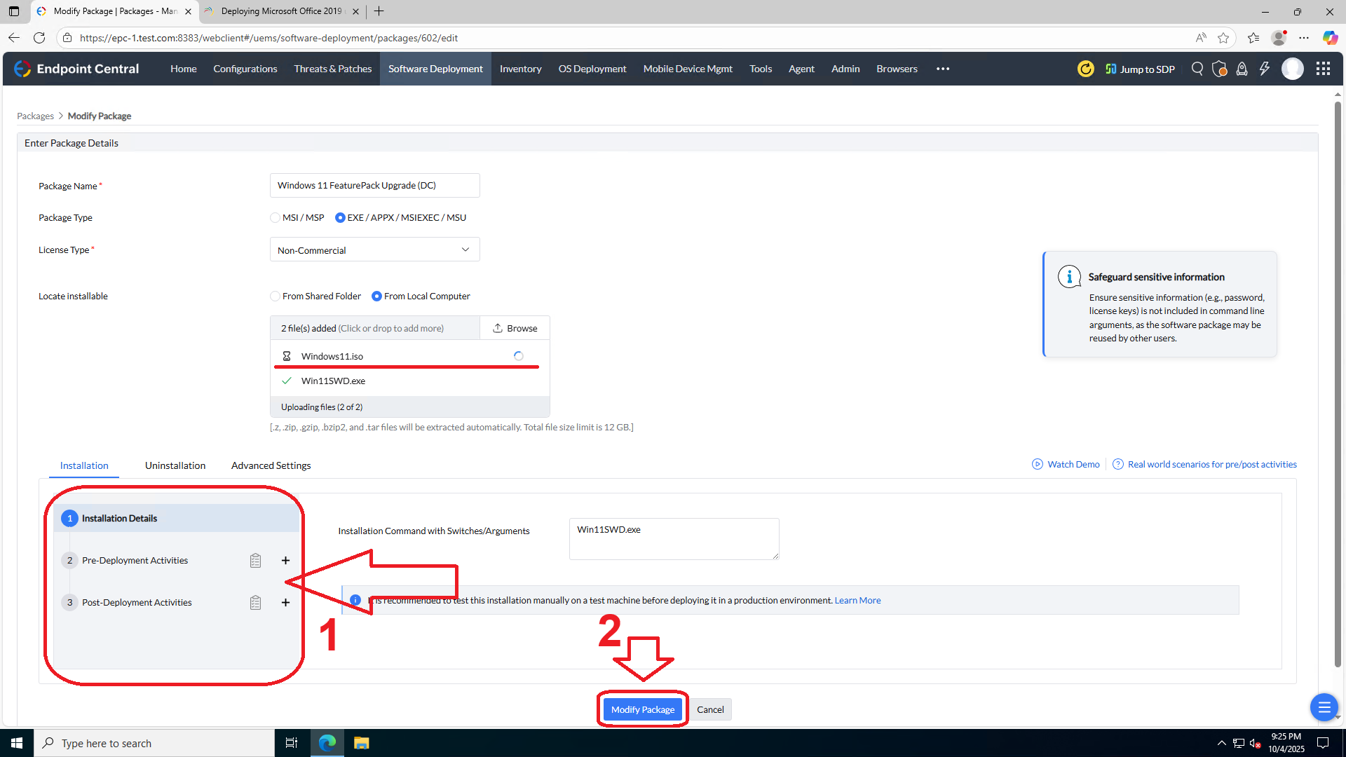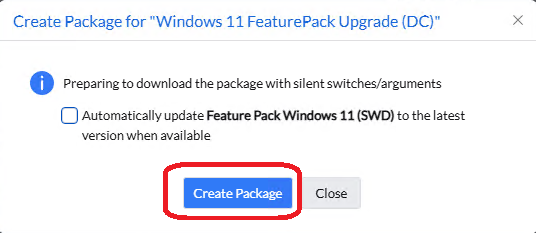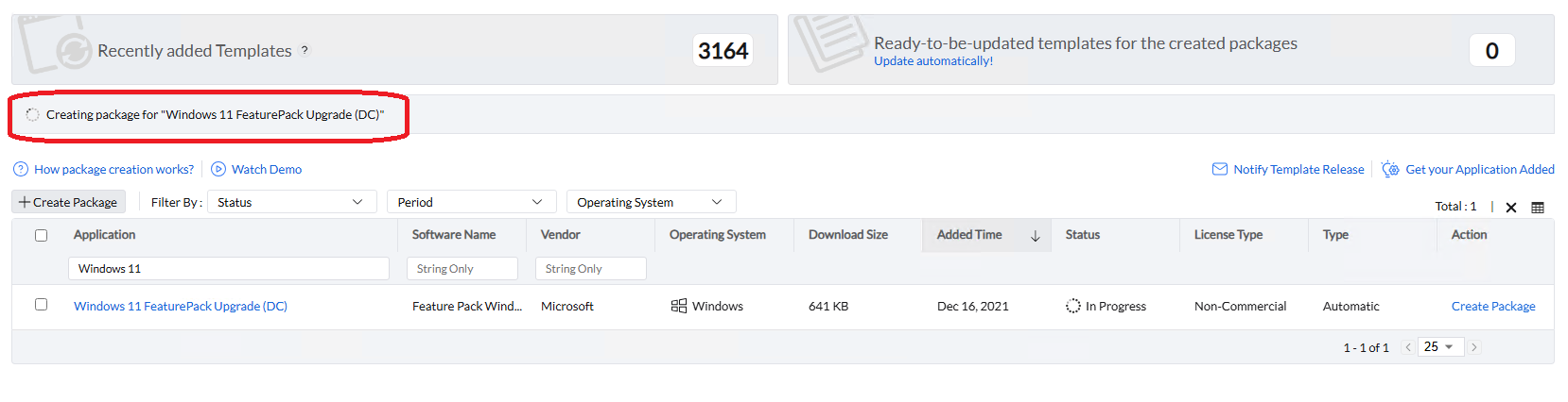 ابتدا در کنسول مدیریت Endpoint Central از قسمت Software Deployment و مراجعه به قسمت Template در فیلد جستجو عبارت Windows 11 را وارد کرده و اینتر می زنیم. مطابق تصویر باید پکیج Windows 11 FeaturePack Upgrade (DC) نمایش داده شود. بر روی قسمت Create Package کلیک می کنیم تا پکیج ساخته شود. اگر پنجره آپدیت پکیج نمایش داده شد می توانیم با انتخاب چک باکس آپدیت اتوماتیک در زمانی که ورژن جدیدی از  این پکیج منتشر شد به صورت خودکار دانلود و پکیج ساخته شود که ما در این تست از این قسمت عبور کرده و بر روی دکمه  Create Package کلیک می کنیم.