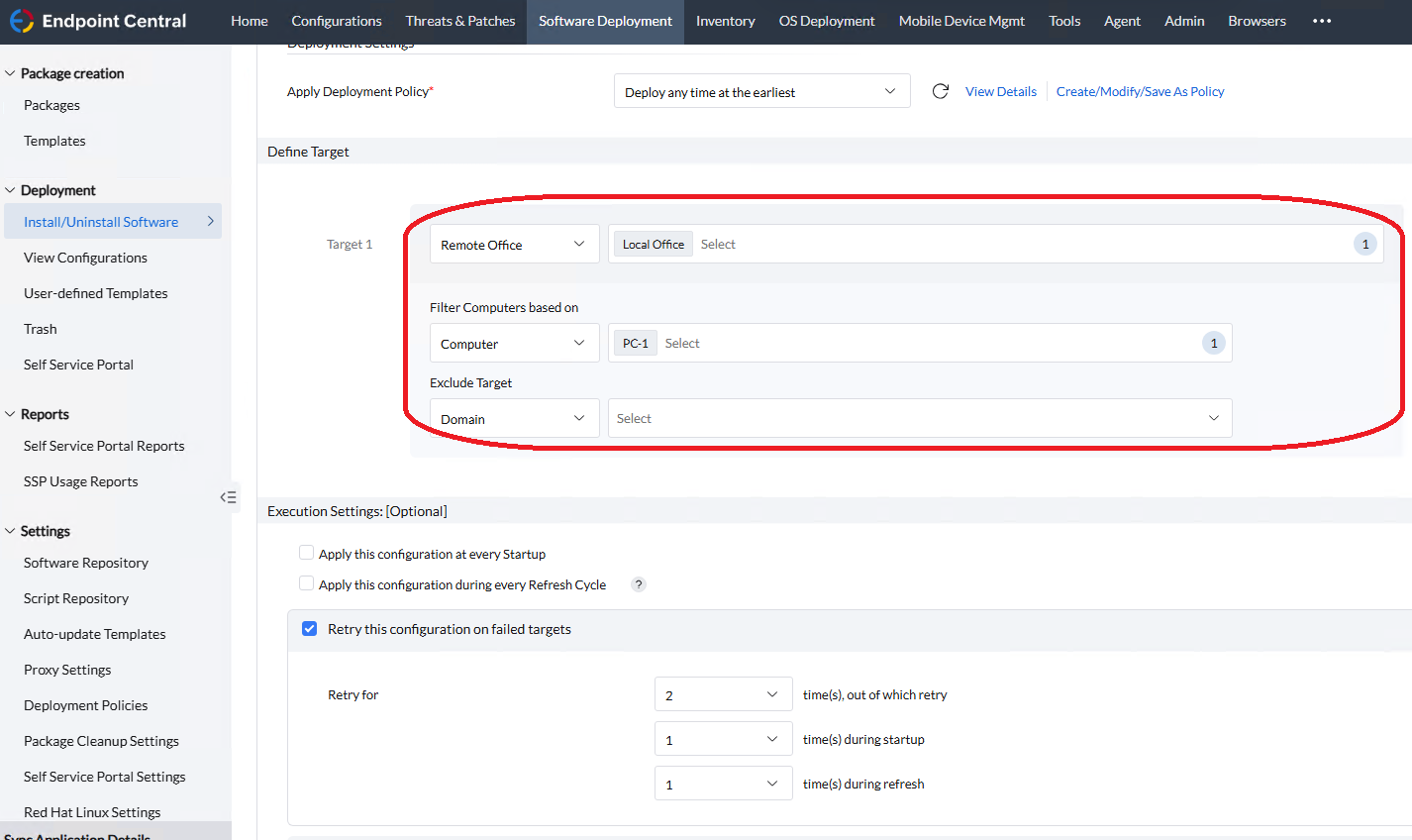 در بخش مهم Define Target باید لیست سیستم های هدف را با توجه به فیلتر های موجود انتخاب کنیم. با انتخاب Local Office دو بخش انتخاب سیستم های هدف و سیستم های احتمالی که باید مستثنی شوند را طبق نیاز خود با استفاده از ابزار فیلتر کردن انتخاب می کنیم.
